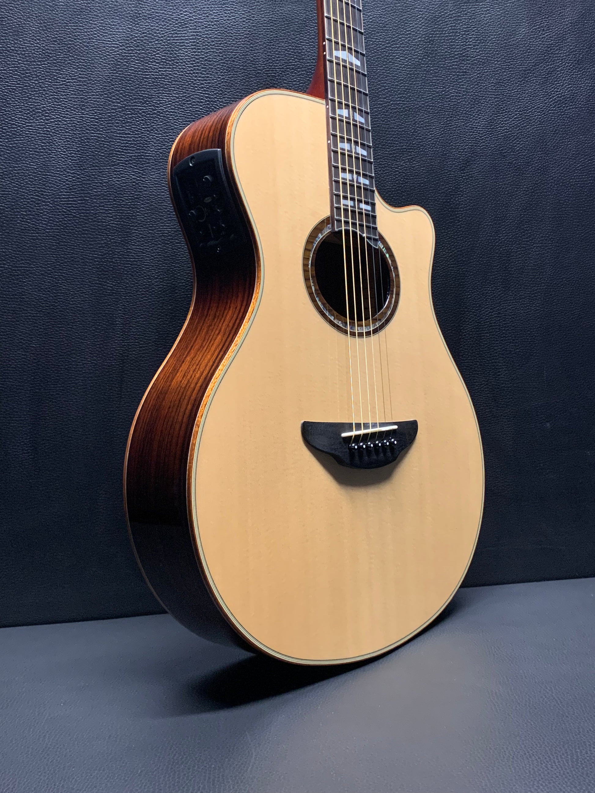 The pinnacle of the APX series, APX1200 features solid rosewood back and sides, Yamaha’s SRT mic-modelling pickup system and premium appointments including mahogany binding, black button tuning machines, and abalone/mother-of-pearl inlays inspired by the legendary SG3000.