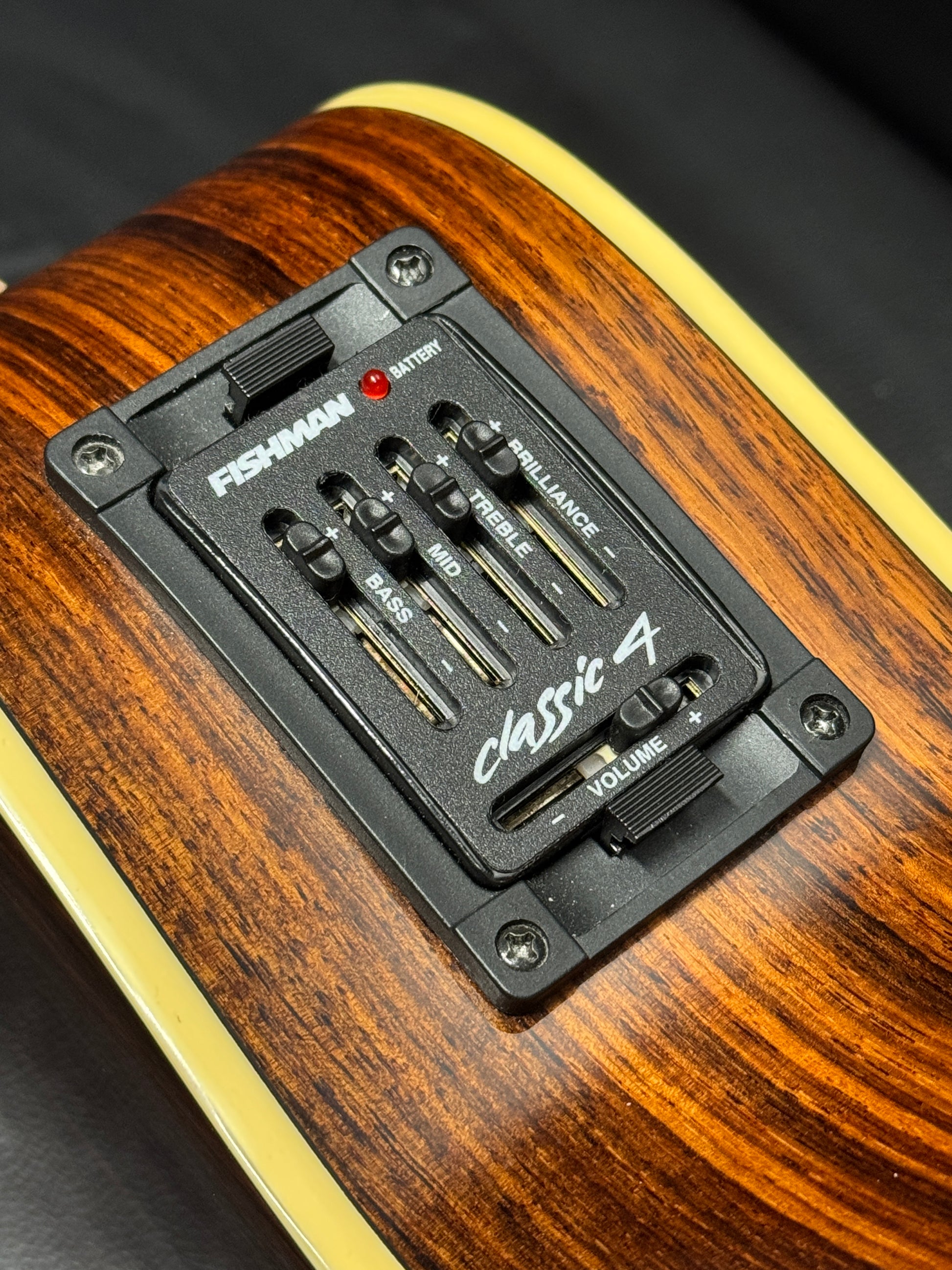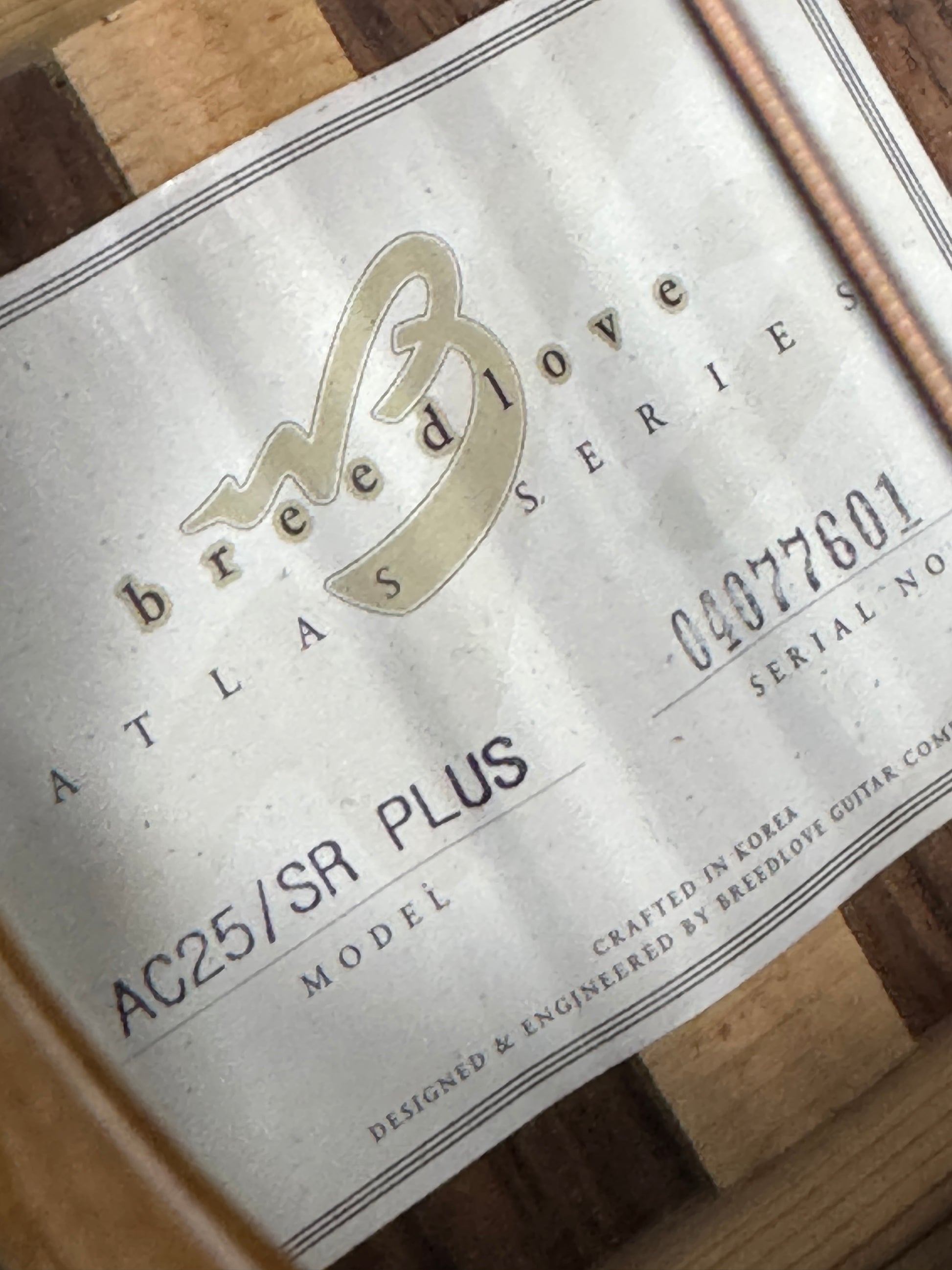 The Breedlove AC25/SR Plus was part of the Atlas First series. It featured a solid Sitka Spruce top with solid Rosewood back and sides, equipped with a Fishman Classic IV pickup. The Plus model featured ivoroid body and neck binding with abalone accents.