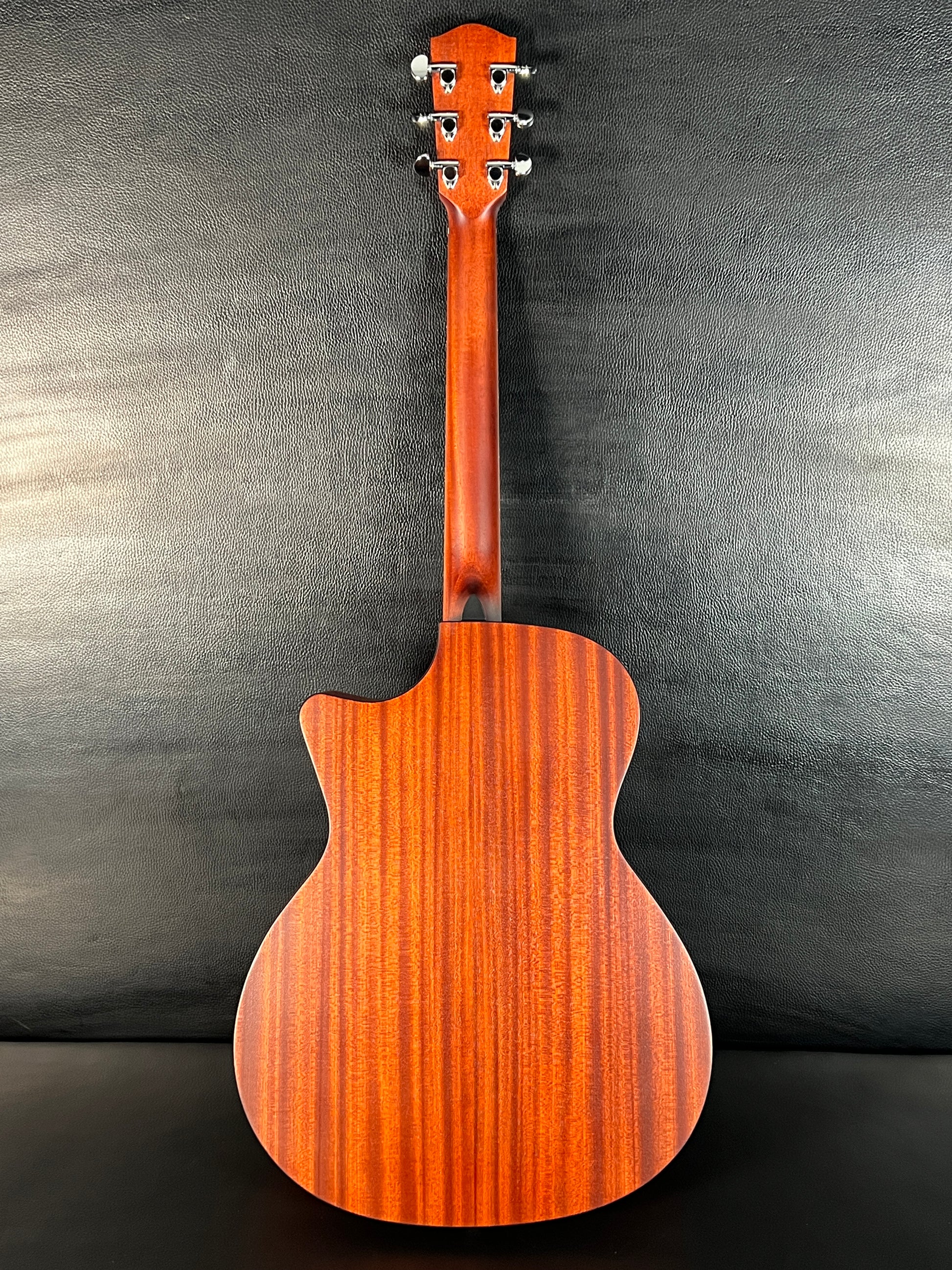 • Laminated sapele back and sides for warmth and durability