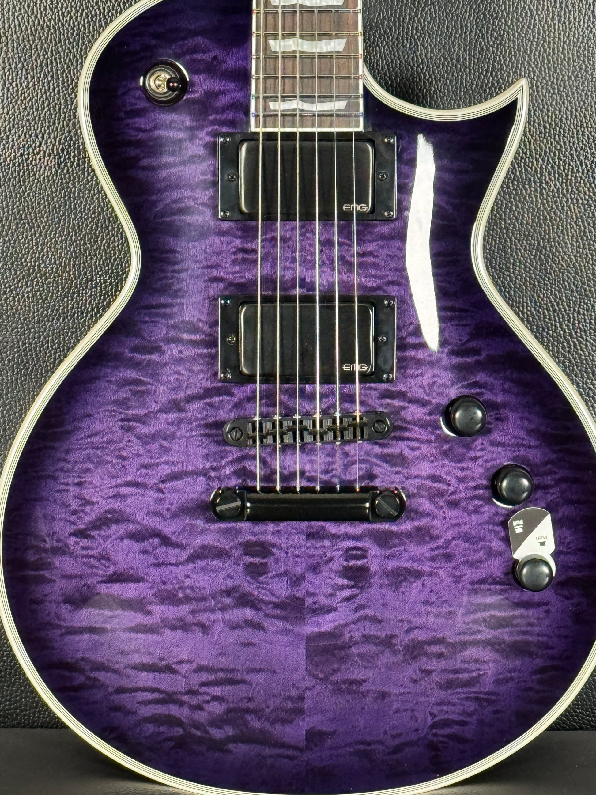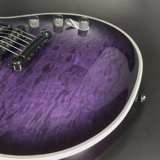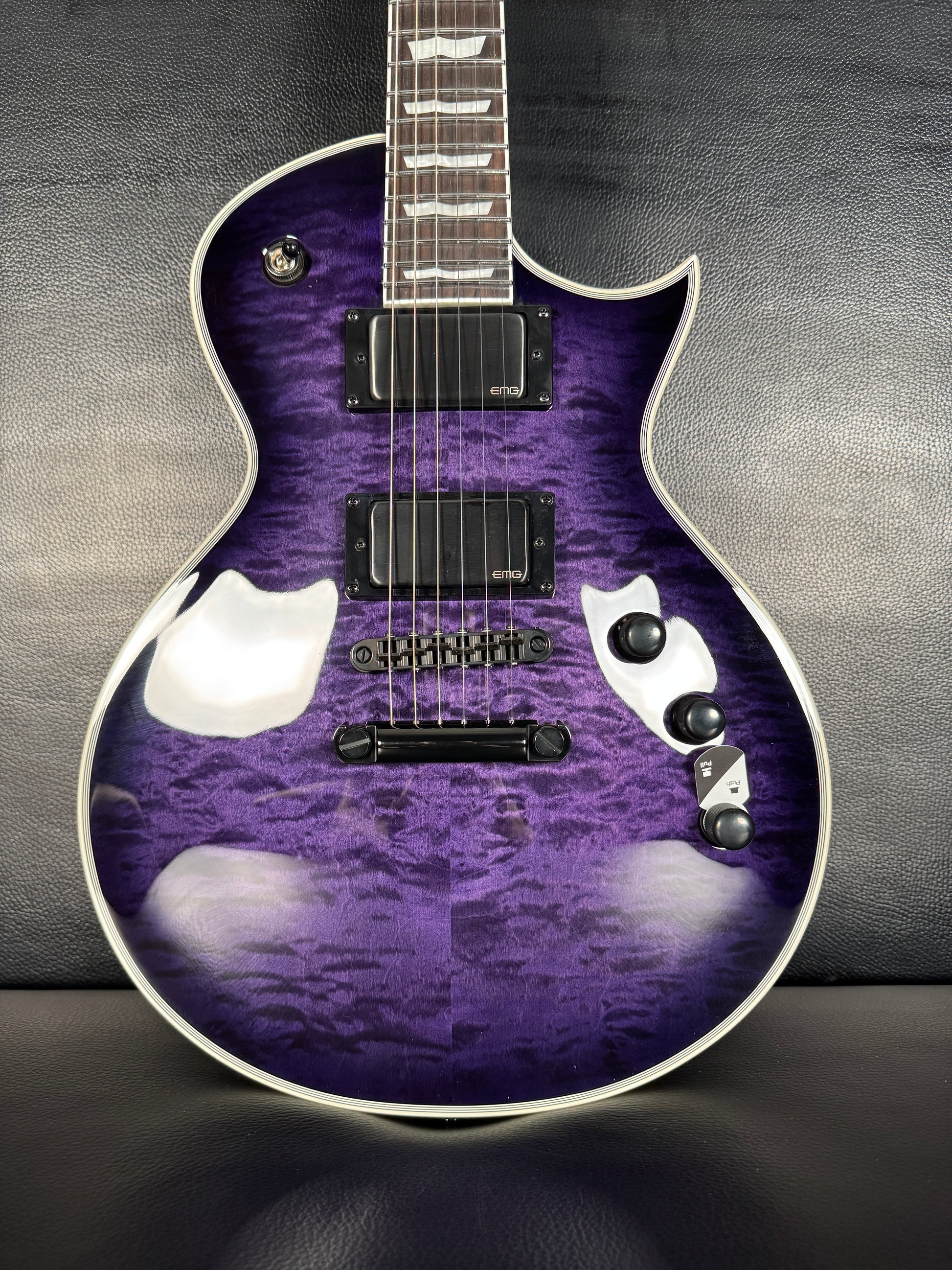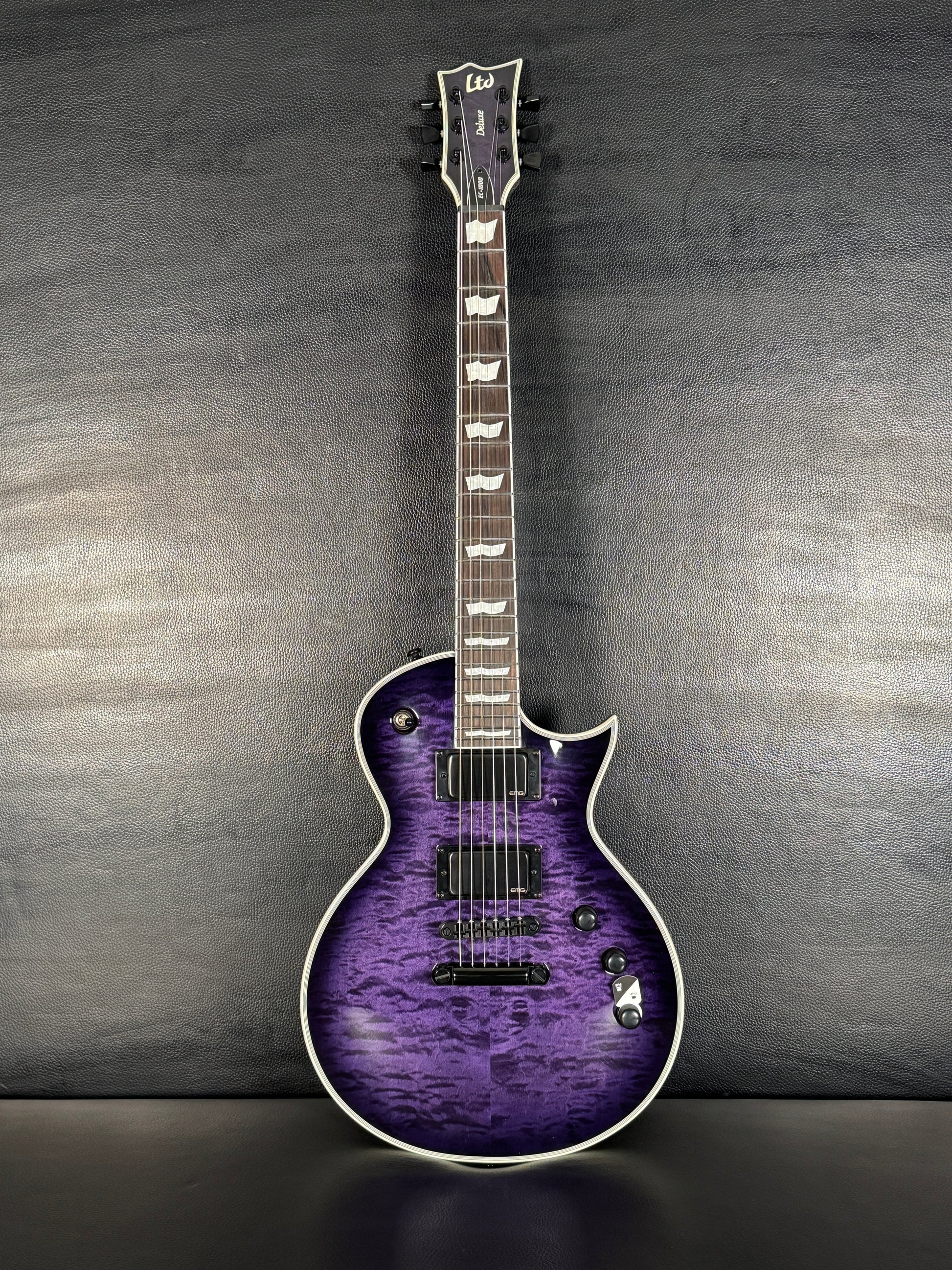 This EC-1000 offers an amazing quilted maple top in See Thru Purple Sunburst finish. Ready for pro-level performances in any genre of music, this guitar offers a set-thru three-piece mahogany neck at classic 24.75” scale, along with a mahogany body. Its Macassar ebony fingerboard has ESP flag inlays and 24 extra-jumbo stainless steel frets for excellent longevity and the smoothest string bending experience. Its sound is powered by a versatile set of a EMG 60TW-R in the neck, with a coil spotting control and the coils reversed so the single coil is closest to the neck, and an aggressive EMG 81 in the bridge position. Other features of this outstanding guitar include multi-ply white binding, black hardware, LTD locking tuners, and a TonePros locking TOM bridge and tailpiece.