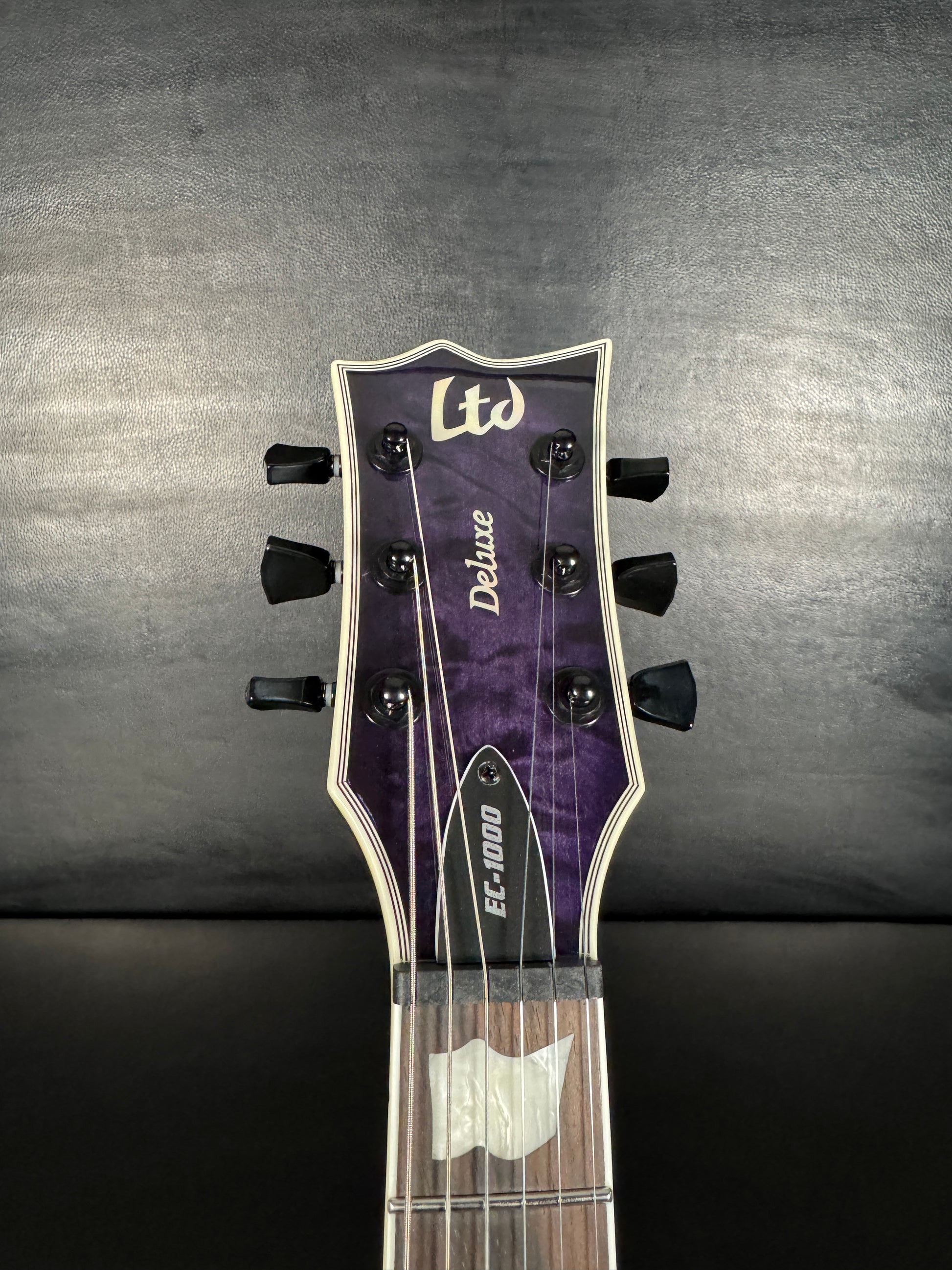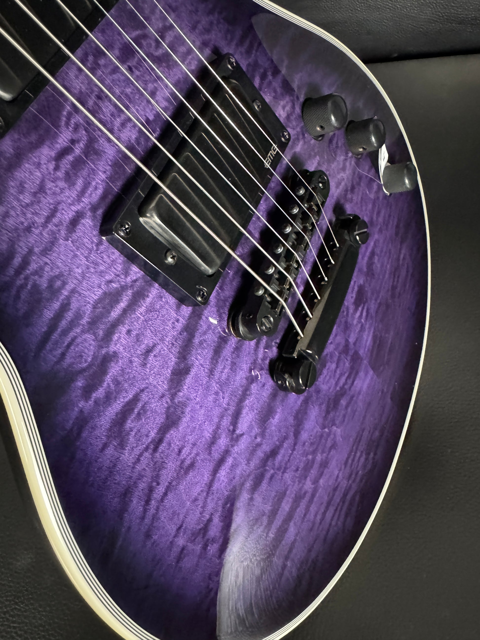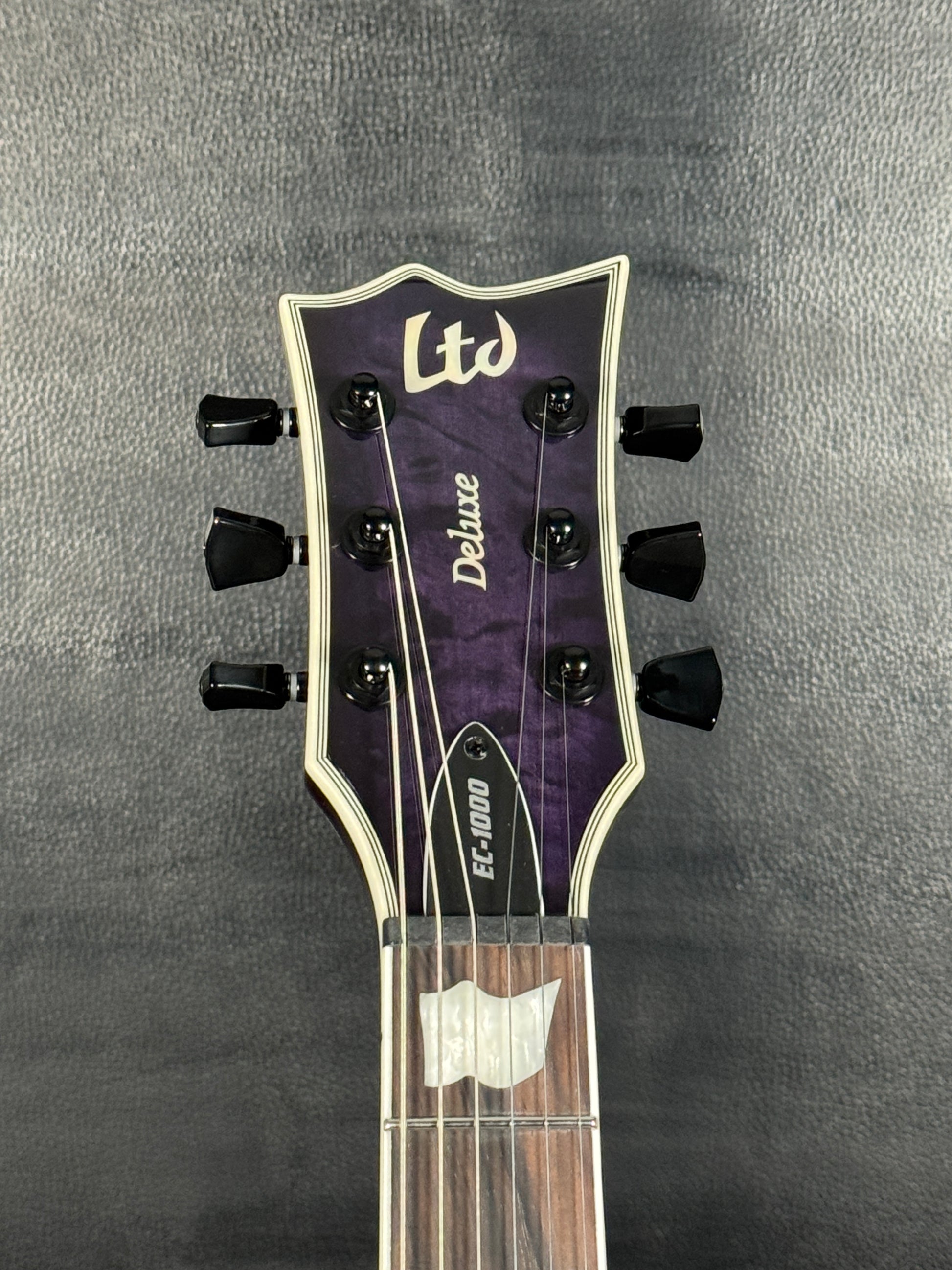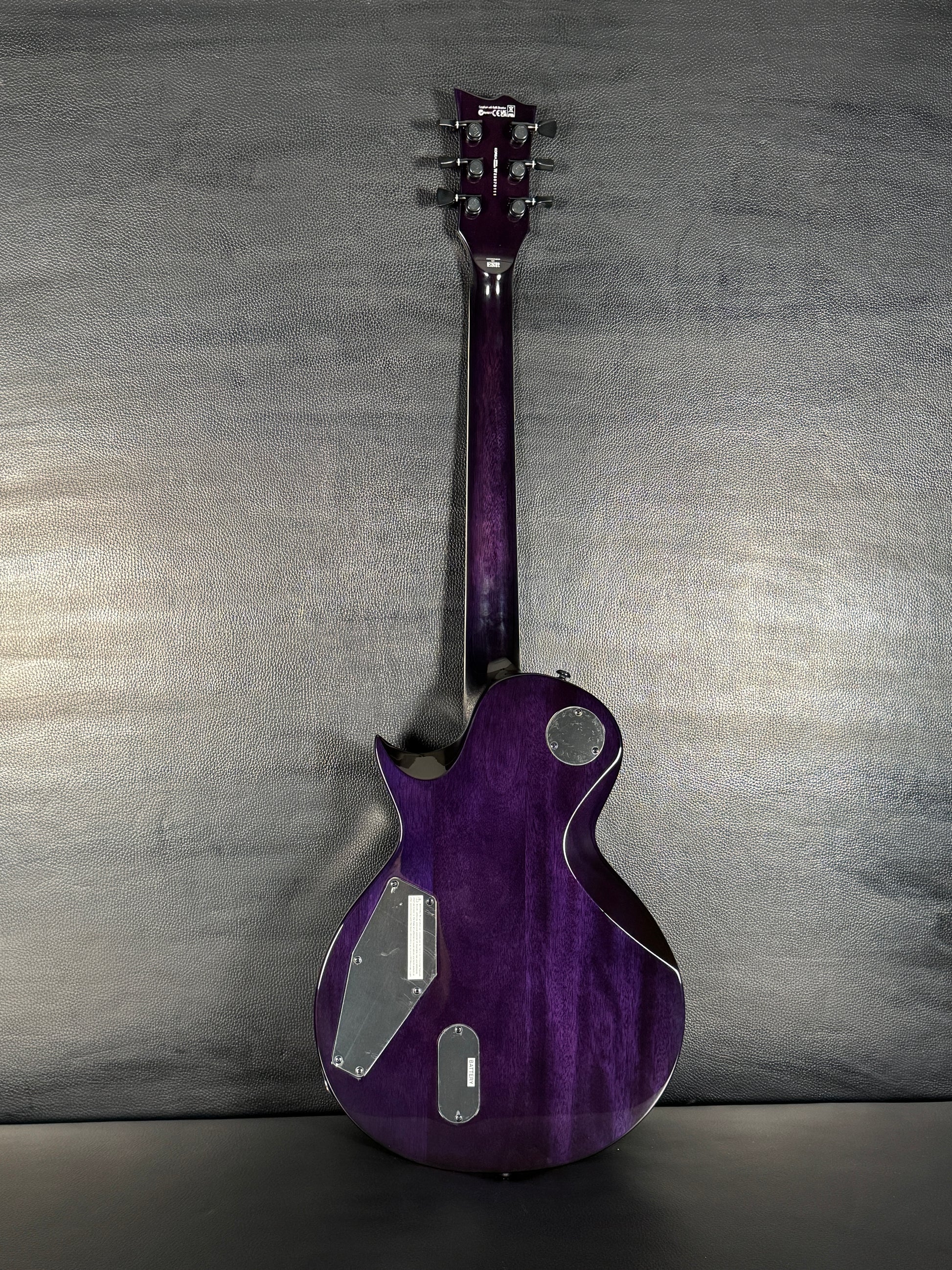 This EC-1000 offers an amazing quilted maple top in See Thru Purple Sunburst finish. Ready for pro-level performances in any genre of music, this guitar offers a set-thru three-piece mahogany neck at classic 24.75” scale, along with a mahogany body. Its Macassar ebony fingerboard has ESP flag inlays and 24 extra-jumbo stainless steel frets for excellent longevity and the smoothest string bending experience. Its sound is powered by a versatile set of a EMG 60TW-R in the neck, with a coil spotting control and the coils reversed so the single coil is closest to the neck, and an aggressive EMG 81 in the bridge position. Other features of this outstanding guitar include multi-ply white binding, black hardware, LTD locking tuners, and a TonePros locking TOM bridge and tailpiece.
