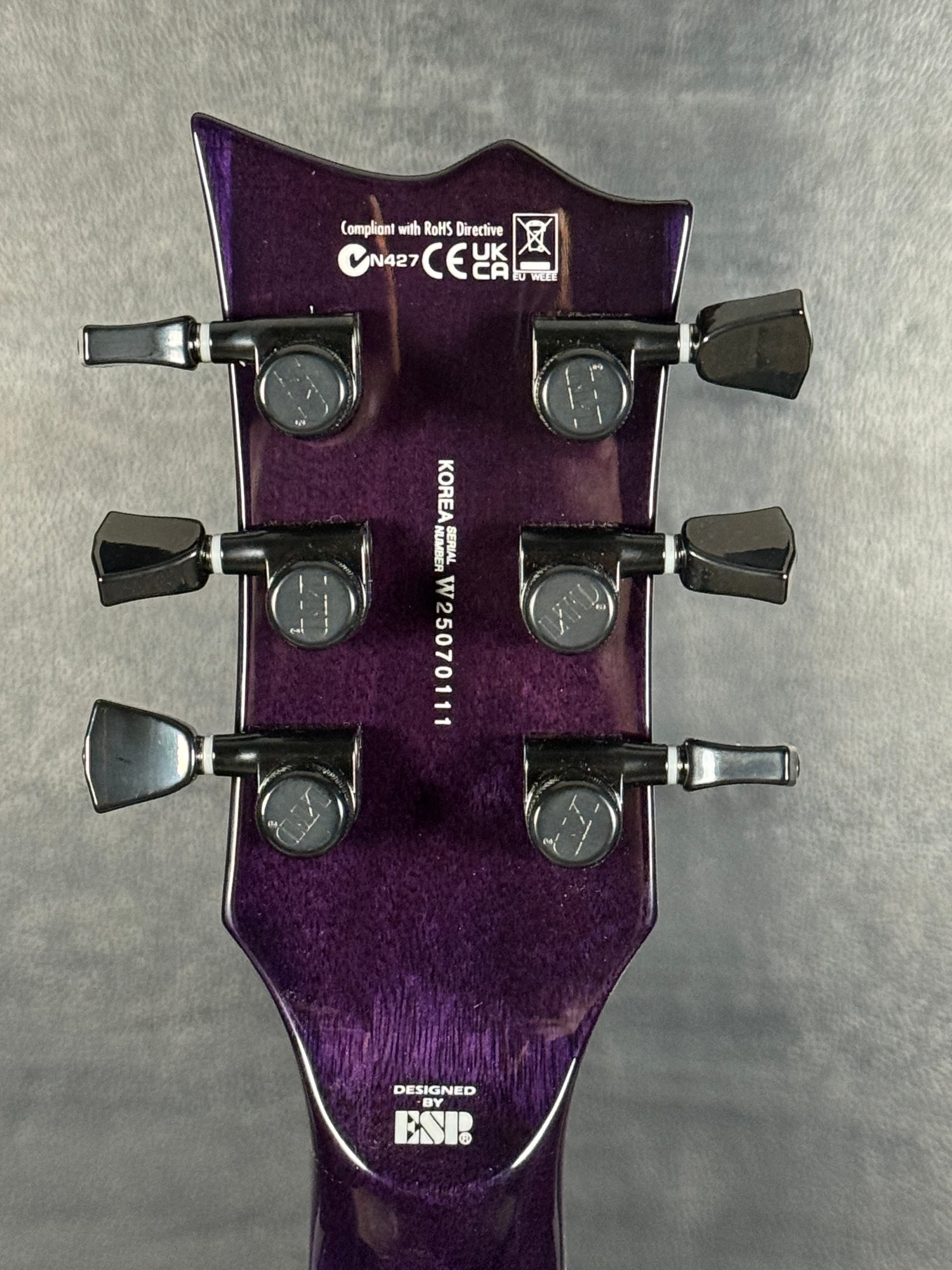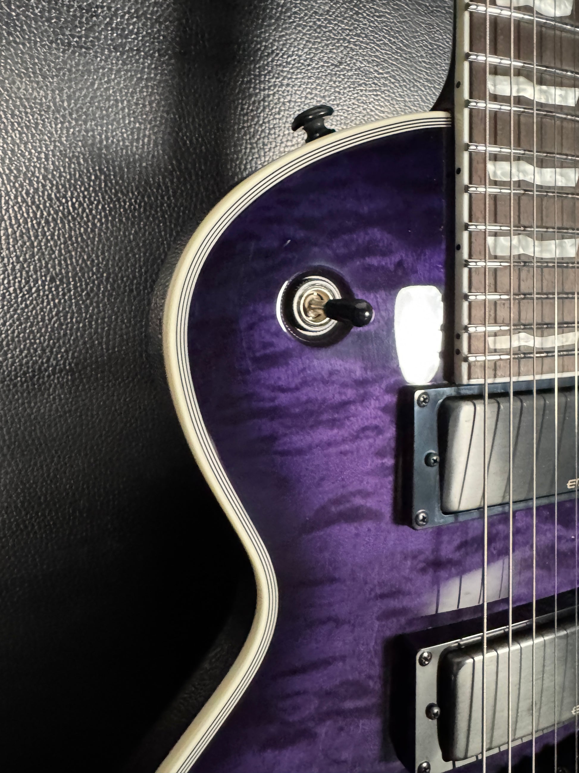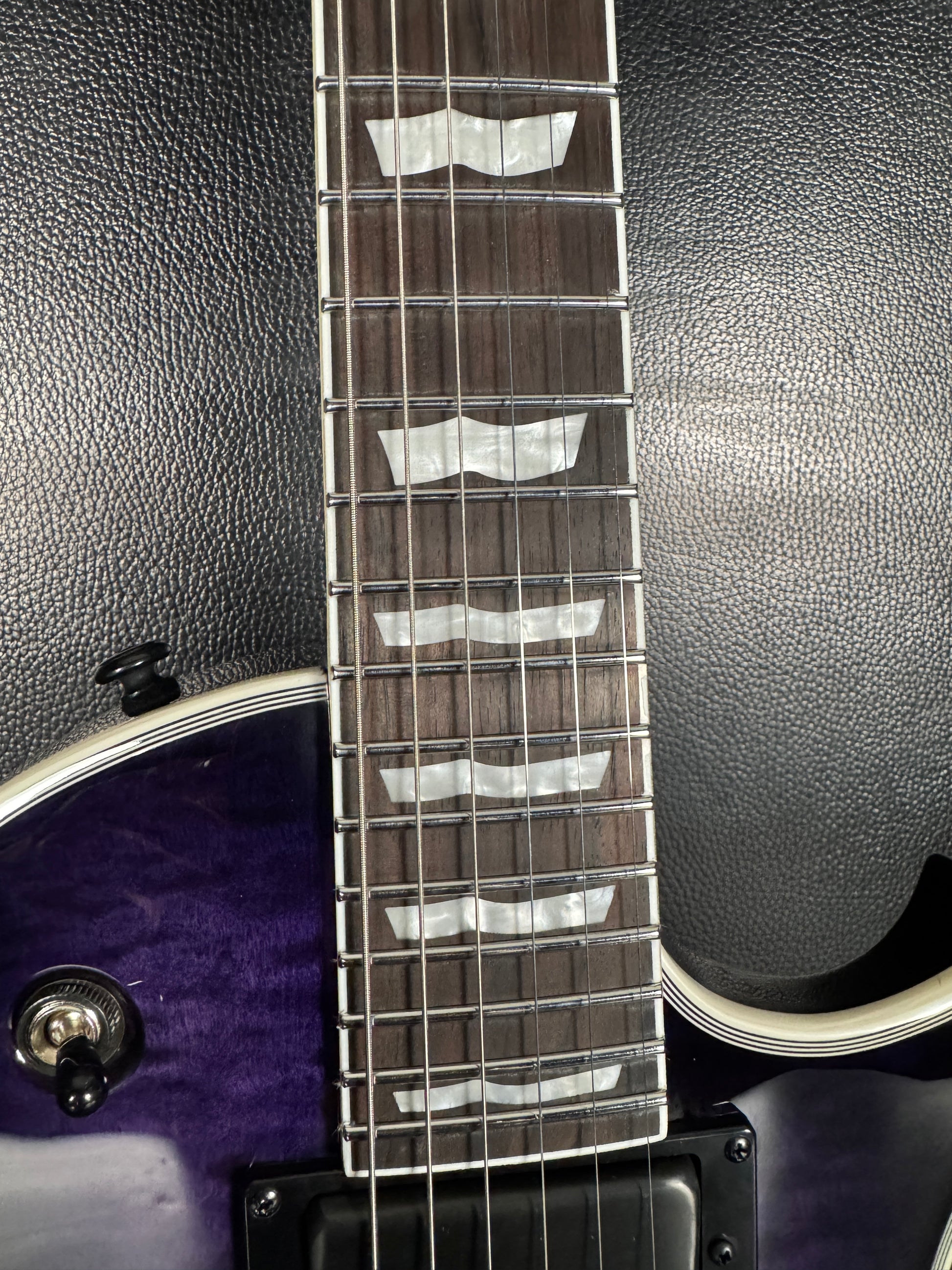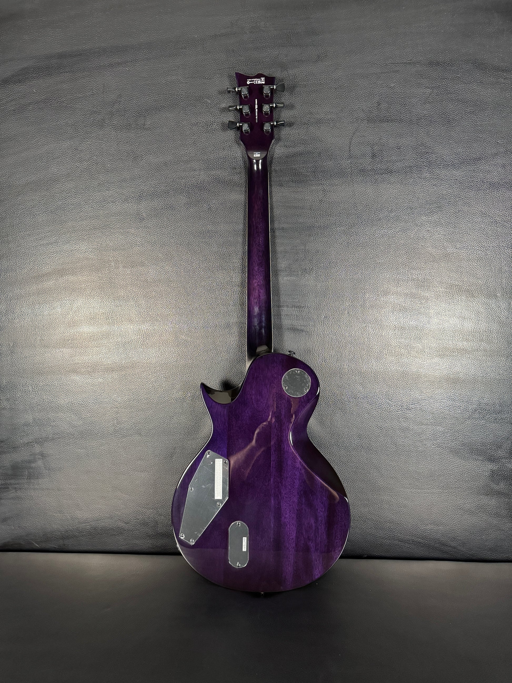 This EC-1000 offers an amazing quilted maple top in See Thru Purple Sunburst finish. Ready for pro-level performances in any genre of music, this guitar offers a set-thru three-piece mahogany neck at classic 24.75” scale, along with a mahogany body. Its Macassar ebony fingerboard has ESP flag inlays and 24 extra-jumbo stainless steel frets for excellent longevity and the smoothest string bending experience. Its sound is powered by a versatile set of a EMG 60TW-R in the neck, with a coil spotting control and the coils reversed so the single coil is closest to the neck, and an aggressive EMG 81 in the bridge position. Other features of this outstanding guitar include multi-ply white binding, black hardware, LTD locking tuners, and a TonePros locking TOM bridge and tailpiece.