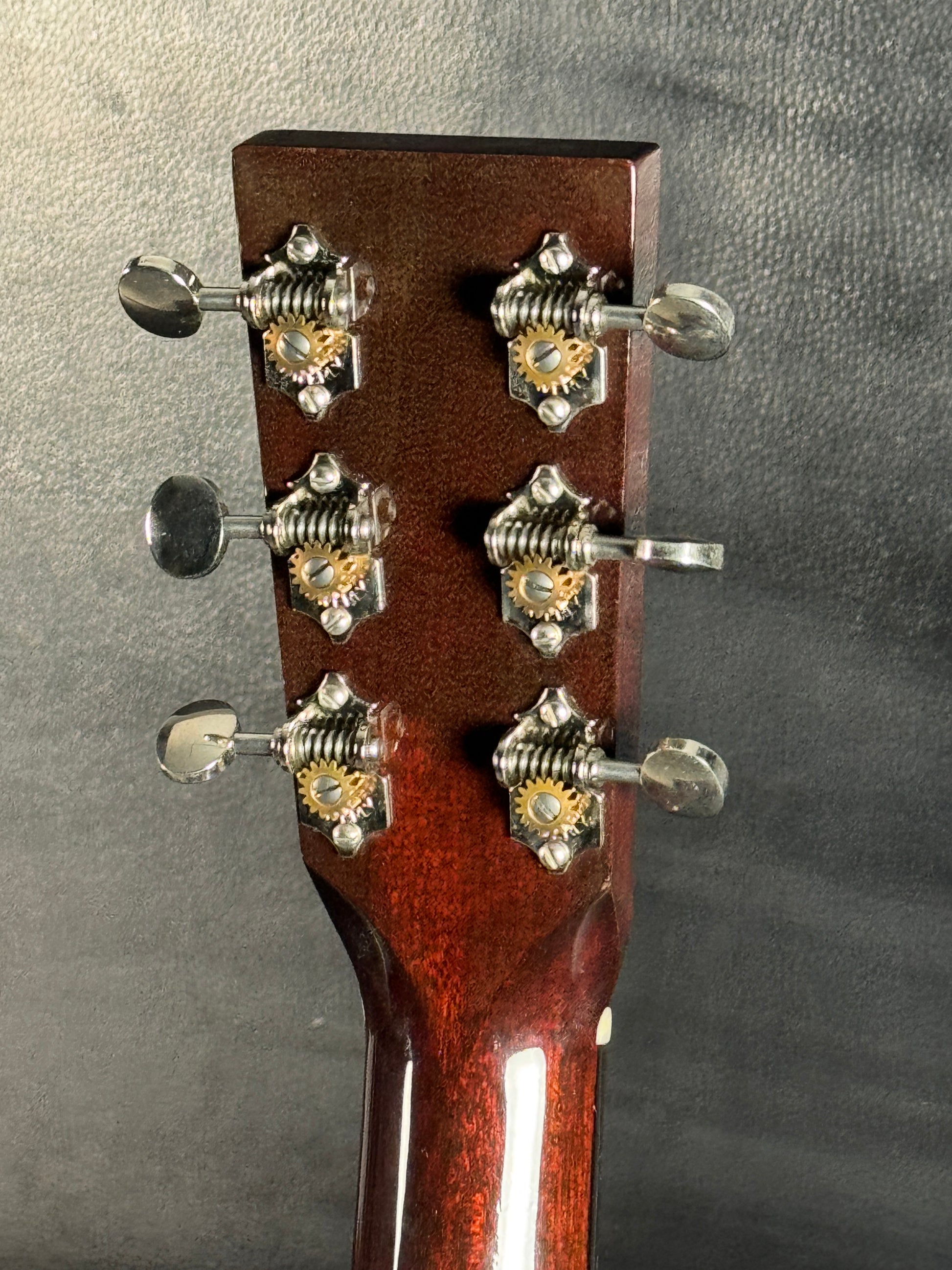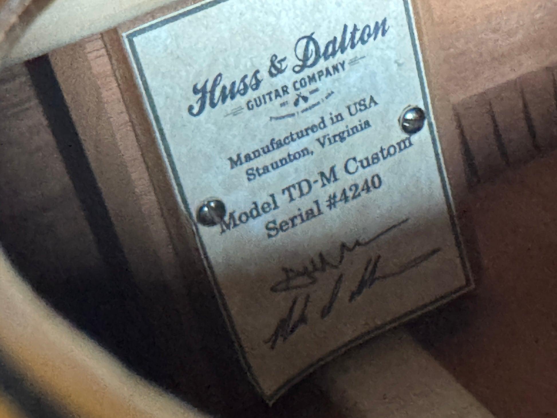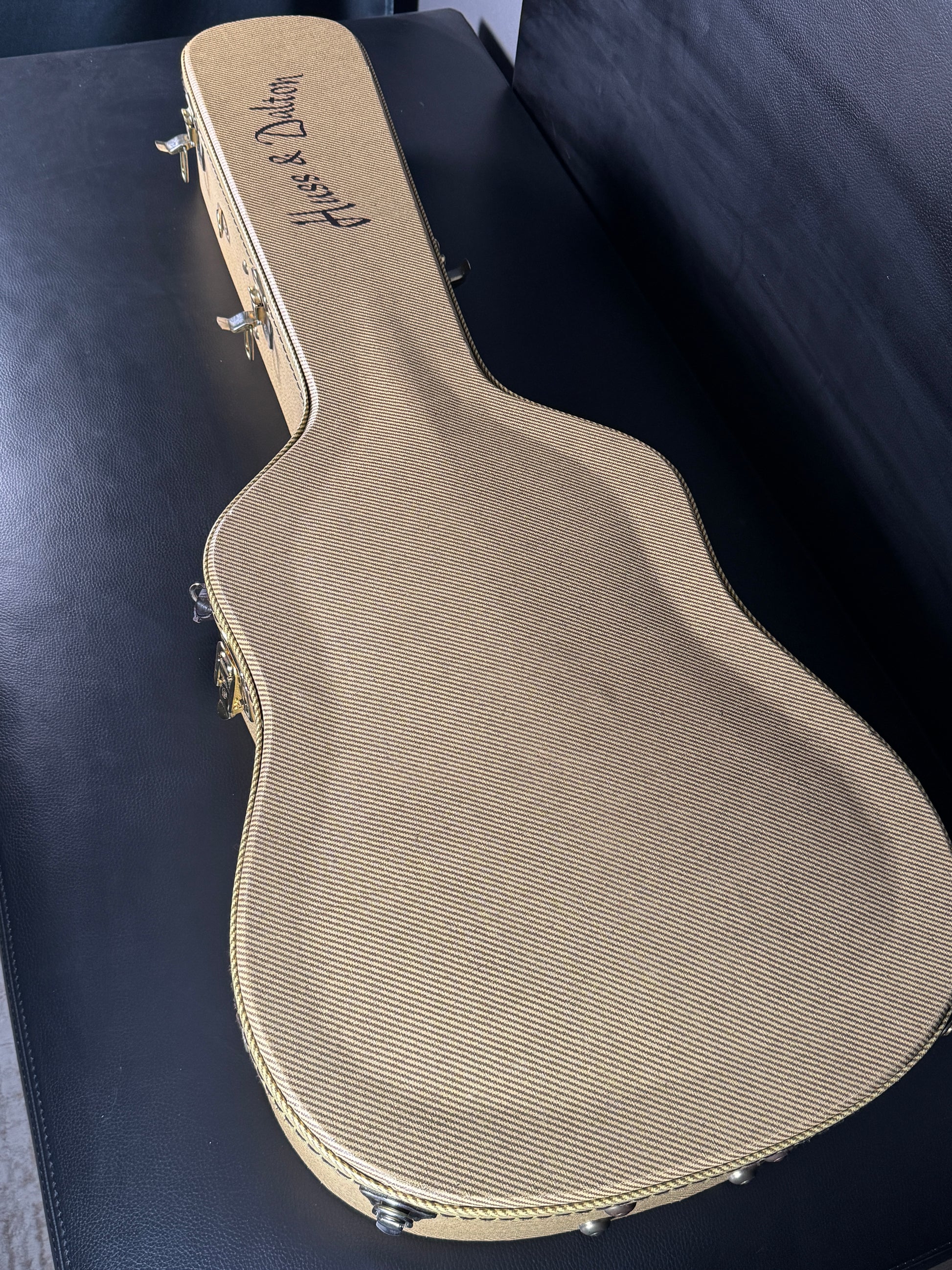 Built in 2014 at the Huss and Dalton shop in Staunton, Virginia, this guitar features a Sinker Mahogany neck, ebony fingerboard and bridge, and an Indian Rosewood headplate. Mother-of-pearl dot markers, a faux-tortoise pickguard, and binding complete the classic aesthetic. Waverly oval-button open-gear tuners ensure precise, reliable tuning.