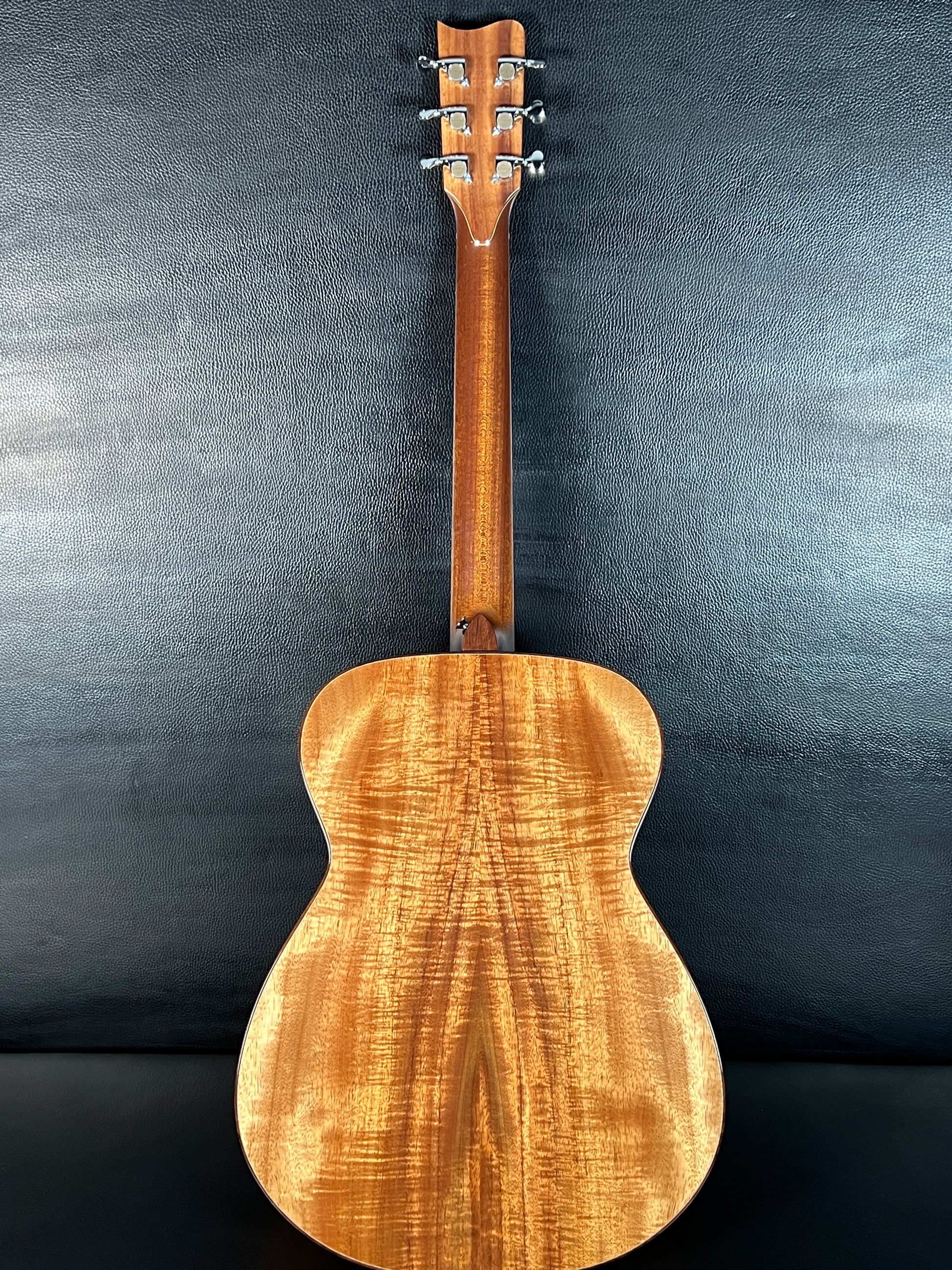 This Folk model features a solid Adirondack spruce top paired with beautifully figured koa back and sides. The Adirondack top offers strong headroom, clarity, and dynamic range, while the koa adds warmth, sweetness, and a focused midrange response. The result is a responsive, articulate instrument well suited to fingerstyle and light to medium strumming.