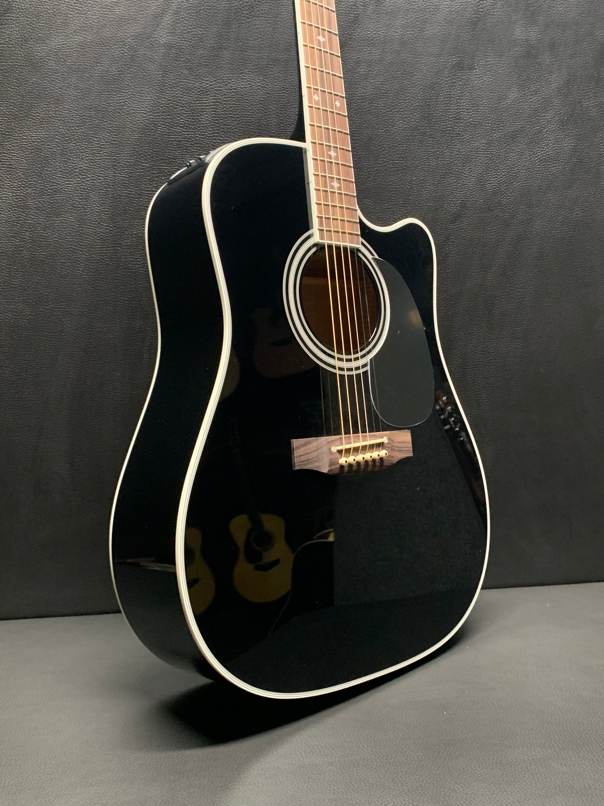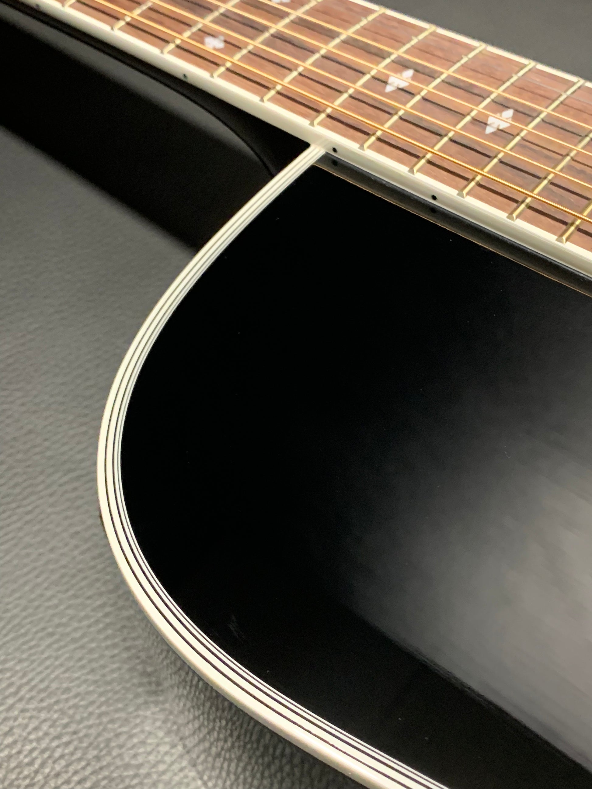 This guitar has been the choice of pro musicians of all genres. The versatility of this guitar begins with its solid cedar top that can play sweet mellow passages or power chords with equal ability. The maple back and sides are a perfect reflector for the tone generated by the soundboard and the gloss black finish looks great under the stage lights. The mahogany neck is joined to the body with a traditional, ultra strong dovetail joint.